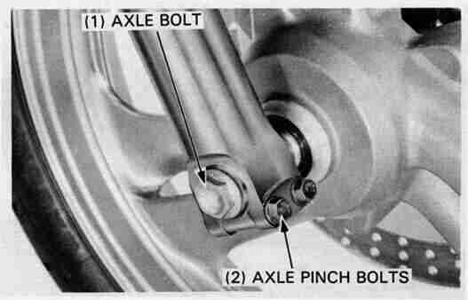 Loosen the right and left front axle pinch bolts, and remove the axle bolt.