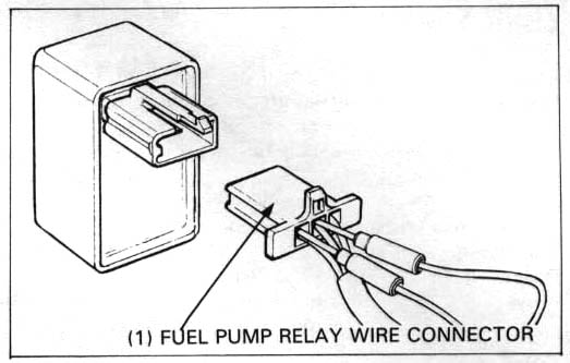 Turn the ignition switch OFF. Remove the seat and disconnect the fuel pump relay wire connnectors. Short the black and black/blue wire terminals with a wire jumper wire.