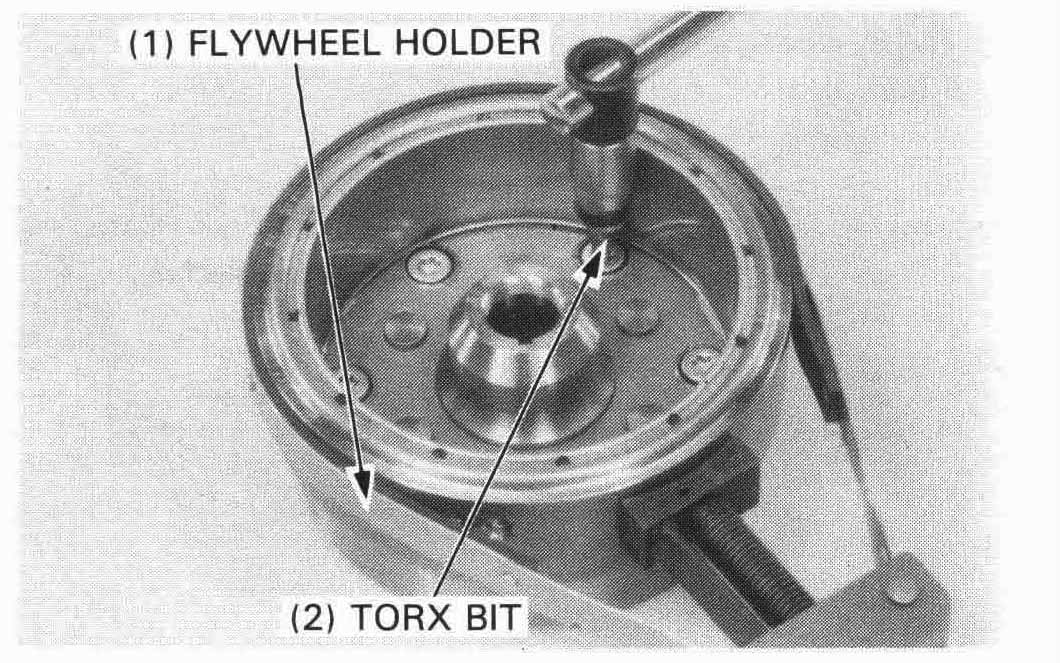 Hold the flywheel with the flywheel holder. Apply locking agent to the torx bolt threads and tighten the bolts.